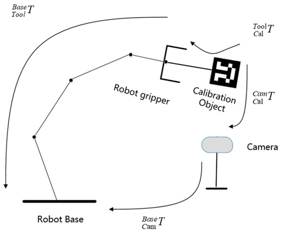 The Tsai–Lenz method is employed to obtain the initial values for ICP matching. In the hand–eye calibration model shown in Figure 1, and are fixed values. can be obtained through camera calibration, and can be derived from the robotic arm’s forward kinematics equation. The transformation of the camera’s coordinate frame relative to the robotic arm’s base coordinate frame is represented by Equation (3):