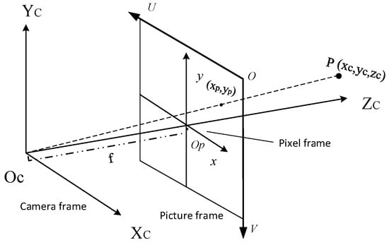 Point is imaged in the pixel coordinate frame , and after undergoing the transformation in the image coordinate frame and subsequent projection, it is imaged in the camera coordinate frame . The transformation relationship is represented by Equation (1).
