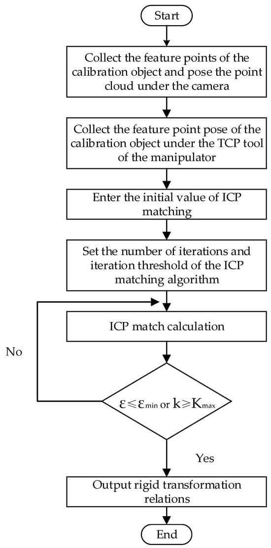In the computation process, it is imperative to incorporate an error threshold and a specified number of iterations to determine when optimal results should be achieved. Otherwise, the efficiency of point cloud registration will be affected due to the large computational workload. In the point cloud registration process, the point cloud error is . When the corresponding point cloud error is for the ()th iteration, the rigid transformation is deemed optimal, and at this point, the corresponding rigid transformation relationship is outputted. Alternatively, a maximum number of iterations can be set, and when the number of iterations is reached, the computation is stopped, and the rigid transformation relationship , at this point, is outputted. This rigid transformation relationship represents the calibrated relationship between the hand and eye with improved accuracy. The flowchart is shown in Figure 3.