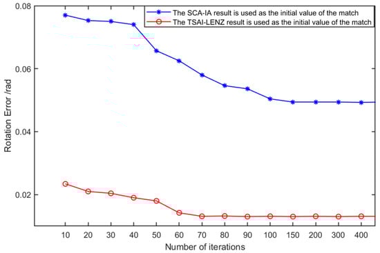 As indicated by the findings presented in Figure 7, when employing the outcomes of the Tsai–Lenz hand–eye calibration as the initial inputs for the ICP matching process, and with a designated matching iteration count denoted by set to 70, the convergence behavior of the rigid transformation matrix remains unaffected. At this juncture, the angular precision error registers at approximately 0.013 radians. Conversely, when utilizing the rigid transformation relationships derived from the output of the SCA-IA algorithm as the foundational values for ICP matching, and with the same designated matching iteration count denoted by set to 150, the rigid transformation matrix successfully converges. Notably, the angular precision error at this convergence point approximates 0.075 radians.