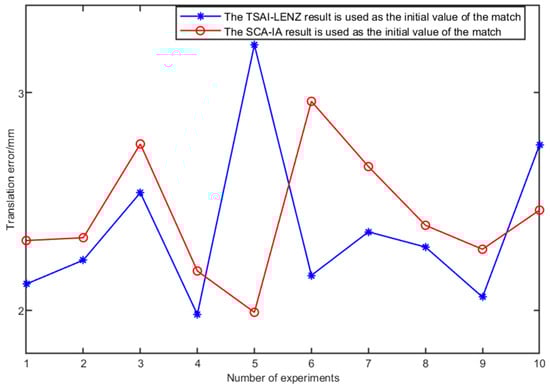 For the purpose of juxtaposing translational errors, a uniform set of ICP matching parameters, denoted by and , was adopted to facilitate a comprehensive analysis of translational discrepancies. A total of 10 calibration experiments were meticulously conducted. The comparative exhibition of experimental data is meticulously presented in Figure 8.