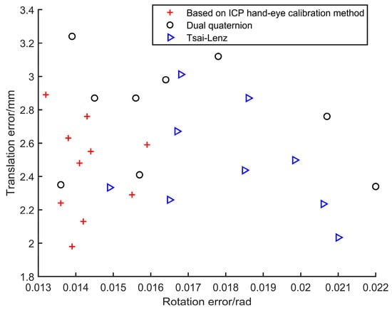 To further substantiate the efficacy of the ICP-based hand–eye calibration method, a comparative study was conducted through 10 experiments against the traditional dual-quaternion method and Tsai–Lenz method. As shown in Figure 9, it becomes evident that, in comparison to the dual-quaternion method and the Tsai–Lenz method, the ICP-based hand–eye calibration method exhibits superior rotational precision. In terms of translational precision, the ICP-based hand–eye calibration method shows comparable results to the Tsai–Lenz method and outperforms the dual-quaternion method.