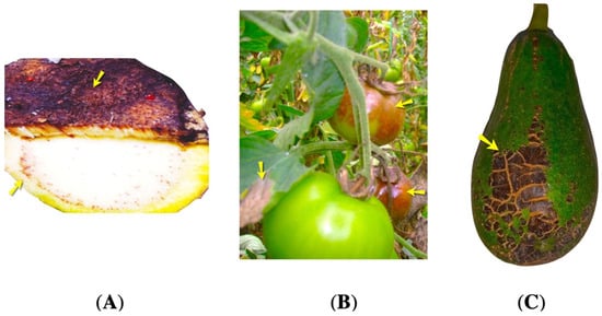 Infected plants. (A) Rachis of Musa paradiasiaca, sample with banana bacterial wilt symptoms (B) Leaves of Solanum lycopersicum, sample with late blight symptoms (C) Fruit of Persea americana, sample with scab lesions. The yellow arrows point out the regions infected regions.