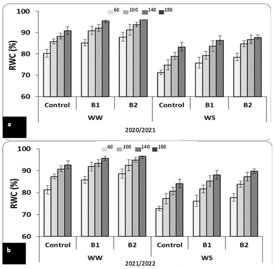 Effect of PGPR and inorganic N applications on RWC of wheat leaves under water stress (WS) and well-watered (WW) treatments at the heading stage during the 2020/2021 (a) and 2021/2022 (b) seasons. The data are means ± SE of three replicates. B1 (A. lipoferum Sp2, control) and B2 (mixture of A. lipoferum Sp2 + Pseudomonas sp. SARS12). WS = Water stress, WW = Well-watered.