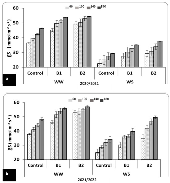 Effect of PGPR and inorganic N applications on stomatal conductance (gs) of wheat under water stress at the heading stage during the 2020/2021 (a) and 2021/2022 (b) seasons. The data are means ± SE of three replicates. B1 (A. lipoferum Sp2, control) and B2 (mixture of A. lipoferum Sp2 + Pseudomonas sp. SARS12(. WS = Water stress, WW = Well-watered.