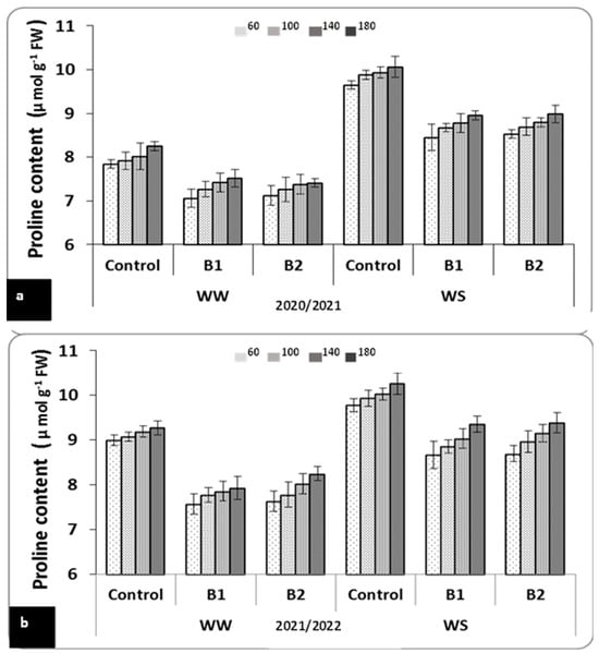 Effect of PGPR and inorganic N applications on proline content (μ mol proline g−1 FW) of wheat leaves grown under water stress at the heading stage during the 2020/2021 (a) and 2021/2022 (b) seasons. The data are means ± SE of three replicates. B1 (A. lipoferum Sp2, control) and B2 (mixture of A. lipoferum Sp2 + Pseudomonas sp. SARS12). WS = Water stress, WW = Well-watered.