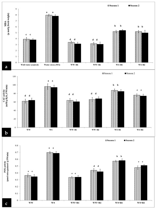 Effect of PGPR and inorganic N applications on MDA (a), CAT (b) and POX (c) of wheat grown under water stress during the 2020/2021 and 2021/2022 seasons. The data are the means ± SE of three replicates. B1 (A. lipoferum Sp2, control) and B2 (mixture of A. lipoferum Sp2 + Pseudomonas sp. SARS12). Different letters are significantly different at p ≤ 0.05.