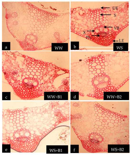 Effect of PGPR and inorganic N applications on the anatomical structure of wheat leaves under water stress conditions. (a): Well-watered (WW); (b): Water stress (WS); (c): WW + B1; (d): WW + B2; (e): WS + B1; (f): WS + B2; B1 (A. lipoferum Sp2, control) and B2 (mixture of A. lipoferum Sp2 + Pseudomonas sp. SARS12). WS = Water deficit stress, WW = Well-watered. UE: Upper epidermis S: Sclerenchyma tissue VB: Vascular bundle X: Xylem Ph: Phloem LE: Lower epidermis.