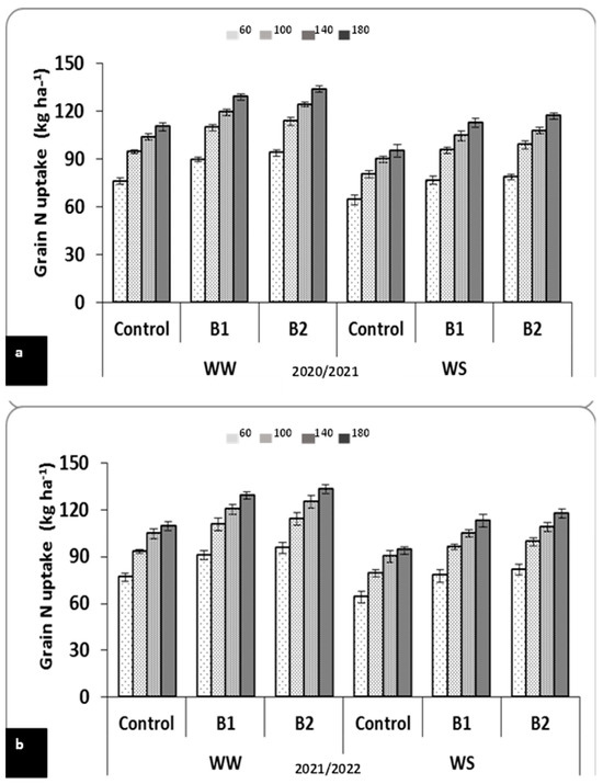 Effect of PGPR and inorganic N applications on grain N uptake of wheat grown under water stress during the 2020/2021 (a) and 2021/2022 (b) seasons. The data are means ± SE of three replicates. B1 (A. lipoferum Sp2, control) and B2 (mixture of A. lipoferum Sp2 + Pseudomonas sp. SARS12).