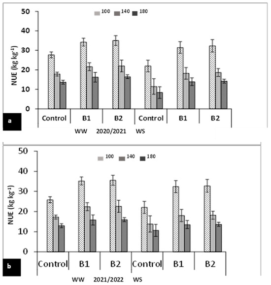 Effect of PGPR and inorganic N applications on nitrogen use efficiency of wheat grown under water stress during the 2020/2021 (a) and 2021/2022 (b) seasons. The data are the means ± SE of three replicates. B1 (A. lipoferum Sp2, control) and B2 (mixture of A. lipoferum Sp2 + Pseudomonas sp. SARS12).