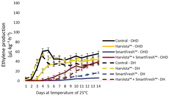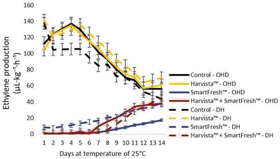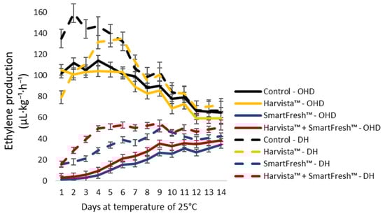 In addition, it was shown that the delay in the harvest date also significantly affected the firmness decline rate of apples transported immediately after harvest. Thongkum et al. believe that the expression of genes involved in ethylene production depends on fruit maturity. Therefore, those genes are less expressed in unripe and overripe fruit than in fruit with optimal maturity, which is reflected in ethylene production [35]. In this study, fruit harvested at the delayed harvest date (DH) produced more ethylene than did fruit harvested at the optimal harvest date (OHD), but this was only the case for apples transported immediately after harvest. Apples untreated with 1-MCP (control) and apples from trees sprayed with Harvista™ produced less ethylene after 9 months of storage than they did when transported immediately after harvest.