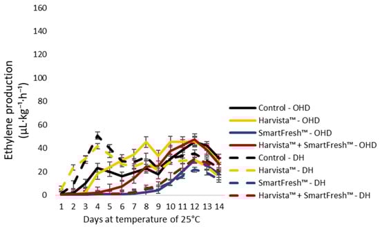 Ethylene production by Gala Schniga® SchniCo Red(s) apples kept at 25 °C after 9 months of storage plus 6 weeks of simulated transport; OHD−optimal harvest date; DH−delayed harvest; ±, standard deviation; n = 48.