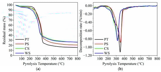 In the first stage (room temperature to 200 °C), the decrease in the TG mass of the biomass was relatively flat, with a mass loss of 2.72–7.39%. The mass loss in this stage was mainly due to moisture elution (Figure 1a). The second stage (200–375 °C) corresponds to the thermal decompositions of hemicellulose and cellulose; in this stage, the decomposition accelerates, whereas the residual mass (wt.%) and mass loss rate (wt.%/°C) decreased sharply. The pyrolysis-induced maximum mass loss rates of CS and WS were observed around 315 °C, whereas those of the sawdusts (PT and PS) were observed around 350 °C (Figure 1b). After the second stage (375 °C), the mass losses of the four biomass types followed a descending order: PT (75.31%) > PS (66.49%) > WS (63.38%) > CS (61.88%). Based on the TG characteristics of the biomass, PT exhibited the highest content of the easily pyrolyzable components. The third stage (375–800 °C) corresponded to the gradual thermal decomposition of lignin [22], where the TG mass curves and derivative TG (DTG) curves exhibited flat trends.
