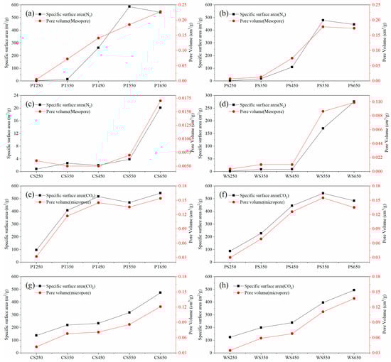 Surface area and pore volume of biochar prepared from PT (a,e), PS (b,f), CS (c,g), and WS (d,h), respectively.