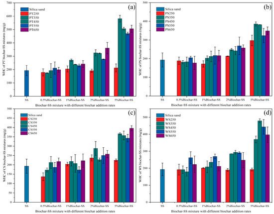Differences in water-holding capacity (WHC) of the biochar–silica sand (SS) mixtures, where the biochar was produced from PT (a), PS (b), CS (c), and WS (d).