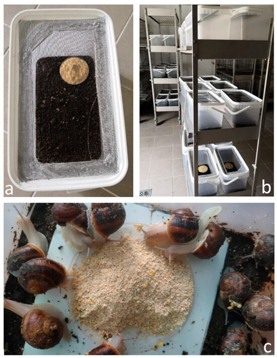 (a) Experimental container; (b) Setting of containers in the animal house; (c) Adult snails foraging on experimental feed.