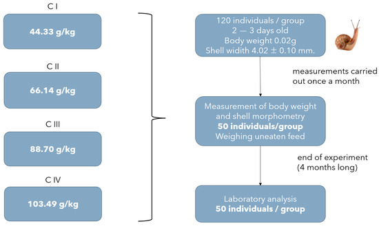 Experiment I was designed to explore the influence of varying Ca concentrations on snail production metrics, shell morphometry, and the nutritional attributes of the mollusc meat (refer to Figure 2). Each month, fifty individuals were randomly selected from each experimental group and their weight and shell width were measured, following the same procedure used at the start of the experiment. Mortality rates for animals within the group were determined, and feed consumption was calculated. Lastly, at the end of the experiment, fifty randomly selected individuals from each group were euthanised through freezing and utilised for further laboratory analyses pertaining to the quality of their carcasses and shells.