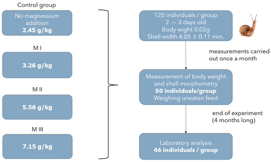 Scheme illustrating the design of Experiment II: categorisation of the groups based on Mg content, details of the snails’ initial body parameters, the methodology for measuring the snails, and the end of the research.