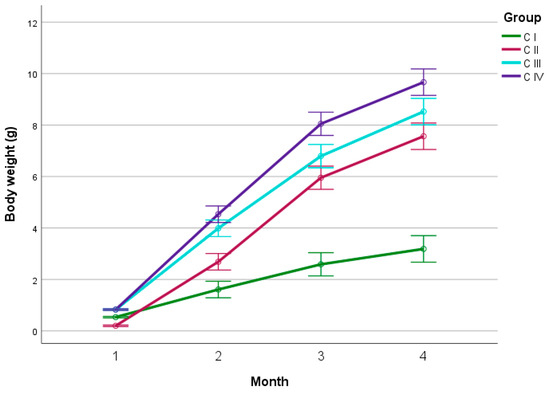 There was no significant difference (p > 0.05) in the body weights of the snails between C III (0.85 g) and C IV (0.68 g) during the first month. Snails in group C II had the lowest weight gain, and those in group C III had the highest (0.18 g vs. 0.83 g). Throughout the second and third months, snails in group C I showed the lowest mean weight gains (1.08 g and 1.65 g), while animals in group C IV showed the greatest (3.87 g and 3.51 g). In the second month, the weights of snails in groups C III (3.99 g) and C IV (4.54 g) did not differ significantly (p > 0.05). Group C I showed the lowest body weight (1.61 g). During the third month, no significant differences were found (p > 0.05), only between C II (5.95 g) and C III (6.79 g). Group C I showed the lowest body weight (3.26 g), and group C IV showed the highest (8.05 g). In the final measurement, there was no significant difference (p > 0.05) in the body weights of snails between groups C II (7.56 g) and C III (8.52 g). At the end of the experiment, snails in the C I group had the lowest mean body weight (3.19 g) and those in C IV, the highest (9.67 g).
