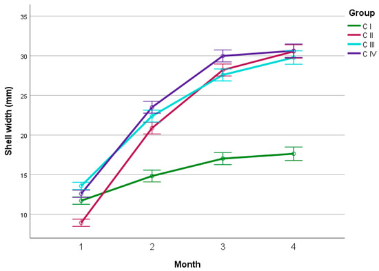 Statistical analysis for the parameters of body weight, shell width, and mortality was performed with the PS IMAGO PRO 9.0 software, using ANOVA tests for repeated measures. The pairwise comparison method with Bonferroni correction was used for significant interaction effects. All study variables met the sphericity condition. A p < 0.05 was taken as statistically significant.