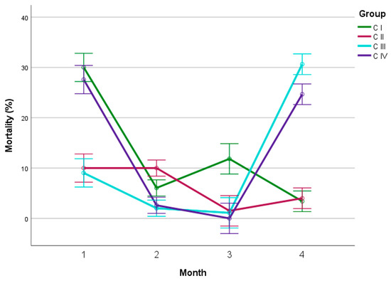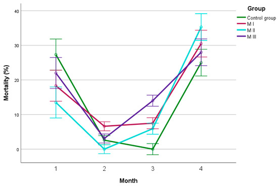 During the initial measurement, mortality exhibited a substantial difference (p ≤ 0.01) exclusively between the CG (27.33%) and MII (13.50%) groups. In the second measurement, no significant differences (p > 0.05) were found while comparing CG (2.6%) and M II (0%), and CG and M III (2.9%). No significant differences in mortality were observed (p > 0.05) between the M I (7.6%) and M II (5.9%) groups after three months of measurements. The mortality rate of group M III was the highest at 13.6%. At the end of the study, mortality rates were noted as follows: CG = 25.00%; MI = 30.50%; MII = 35.28%; and MIII = 28.00%. Only the CG and MI groups showed significant differences (p ≤ 0.01).