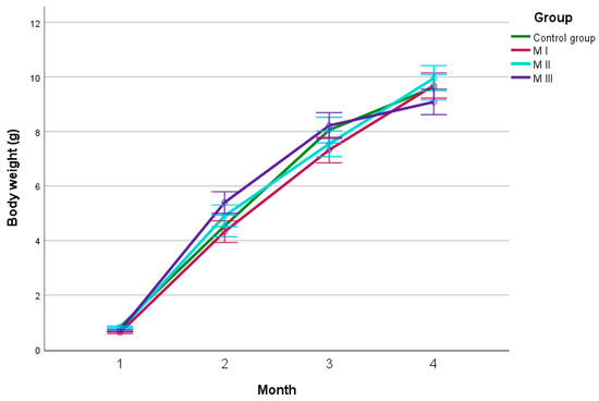 The development of snails is characterised by three stages that can be distinguished: slow growth of the body and rapid development of the internal organs in the first month, rapid increase in body weight in the second and third months, and stabilisation of body weight and a slowdown in growth after 13 weeks of age [12]. The results of the measurements carried out in each month of Experiment I and Experiment II are presented in Figure 4, Figure 5, Figure 6, Figure 7, Figure 8 and Figure 9.