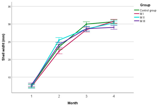 No significant difference was observed in shell width during the first month of the experiment (p > 0.05). Among all groups, M I had the smallest shell width (12.34 mm), while MIII had the largest (12.84 mm). However, shell width varied significantly (p ≤ 0.05) between CG and M II (25.41 mm), M I (22.30 mm) and M II, as well as between M I and M III (24.14 mm) during the second month of measurements. Similarly, during the third measurement round, significant differences were found (p ≤ 0.05) between the CG (29.98 mm) and M I (28.39 mm), CG and M II (28.72 mm), and CG and M III (28.68 mm) groups. Significant differences in shell width (p ≤ 0.01) were observed between groups CG (30.66 mm) and M III (29.03 mm), M I (30.79 mm) and MIII, and between M II (30.30 mm) and MIII by the end of the measurements. The largest shell width of 30.79 mm was observed in M I, while the smallest width of 29.06 mm was observed in M III. Regarding shell width gains, the M II group had significantly more substantial gains: 18.25% greater than the control group in the first month (13.04 mm vs. 11.03 mm). In contrast, in the third month, the M II group had significantly smaller gains: 47.77% less than the control group (3.31 mm vs. 6.36 mm). In the last month, the M I group had the highest increase in shell width—2.40 mm. Furthermore, the largest shell width change over time was found in MI (+18.45 mm) and the smallest in MIII (+16.21 mm).
