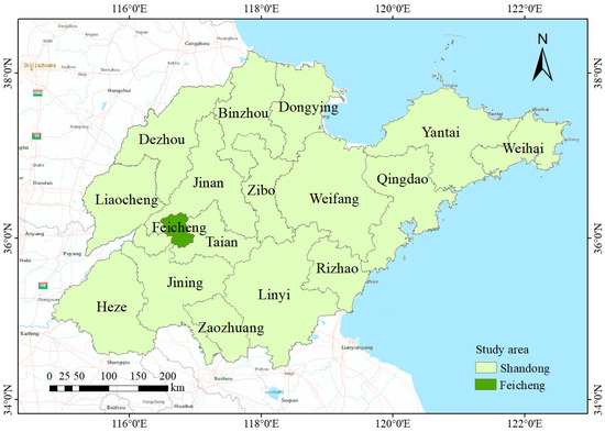 This study was conducted in Shandong Province, which lies in the coastal area of East China, bordering the Bohai Sea and the Yellow Sea, and extending from 34.38° N to 38.40° N and from 114.79° E to 122.71° E (Figure 1). This province belongs to the warm temperate monsoon climate, with an average annual temperature range of 11–14 °C, an average lighting hours range of 2290–2890 h, and an annual average precipitation range of approximately 550–950 mm. The planting area is 83,845.42 km2, accounting for 53.82% of the province’s area. Grain crops are planted in the summer and autumn, and wheat, corn, peanuts, soybeans, etc., are the main grain crops in Shandong. The demonstration county was selected to be in Feicheng, which is located in Tai’an City.