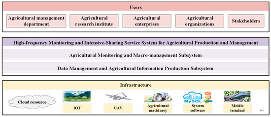 The high-frequency monitoring and intensive sharing service system was built around the specific needs of macro-management and fine-scale agricultural monitoring and information services in agricultural production. Based on the current hardware infrastructure and key technologies, we designed and developed a data management and agricultural information production subsystem and an agricultural monitoring and macro-management subsystem. We aim to provide an information-enabled agriculture service for various levels of agricultural management departments, scientific researchers, agricultural enterprises, farmers, and other users. This system will provide technical support for the development of regional agricultural intensive sharing operation mode and set an example for the application of the IoT, the Internet, and other technologies in the agricultural field. The system framework proposed in this study is presented in Figure 2 and Figure 3.