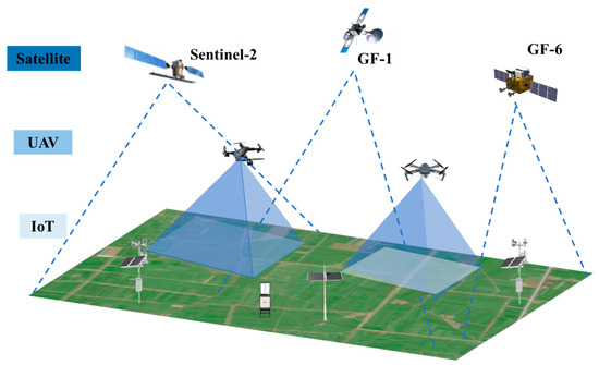 Remote sensing satellites provide us with the ability to quickly obtain rich band information in a large range of images, while the development of UAV remote sensing technology and the ground Internet of Things technology can provide more flexible observation methods to obtain rich spatial details and high-accuracy ground information with a spatial resolution of up to the centimeter level [15,16,17]. Among them, sensors such as RGB, hyperspectral, and thermal imaging cameras can be used for all applications of drone remote sensing in precision agriculture research. In addition, there has been improvement in the performance of ground IoT devices, such as ground meteorological sensors, soil sensors, and spore collectors, which provide detailed crop morphology and parameter information for agricultural monitoring applications, such as drought stress monitoring, disease or pest monitoring, growth monitoring, and yield prediction [18]. These ground-station observations can provide absolute and true measurement values of discrete points in continuous time series, but it is difficult to achieve a large range of area with full coverage in space. Relying solely on any single data set for agricultural information monitoring will lead to difficulties in meeting the high standards of product accuracy, time frequency, reliability, and other practical application requirements. Therefore, coupling land parcels from satellite observations, surface features obtained from UAVs, and ground data obtained from IoT technology are effective ways to achieve high-frequency and high-accuracy monitoring of agricultural information [19,20].