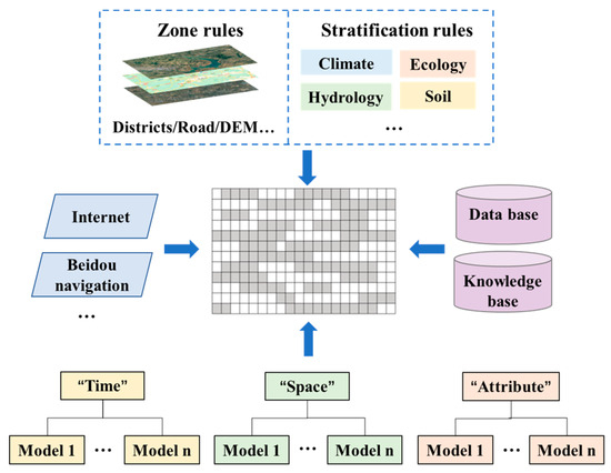 In the process of professional model integration, the model accuracy of some specific regional applications may be relatively low, or the supervised samples may be increased due to neglecting the complex characteristics of agricultural information inversion and the limited suitability and generalization ability of the model algorithms. To solve these problems, this study was guided by artificial cognitive mind and comprehensively analyzed the laws of similarity and heterogeneity in the distribution of geographical elements. Following a top-down approach, we constructed an integrated framework of the “zone-stratification” model [49]. To meet the needs of different regions, zoning rules were formulated with agricultural geographical zoning by integrating various types of multi-source, heterogeneous, and multiscale data, and we combined road networks, terrain lines, river networks, and other elements with the zoning range, image resolution, and interpretation unit size to divide the target area into several relatively independent interpretation task areas [50]. Within each geographical zone, based on the remote sensing features of the analyzed object, we developed processes of model operation and production and integrated different thematic information production models; then, various agricultural information was extracted by layer based on temporal, texture, and other features, which enabled the zone-stratification model to have the ability to automatically generate product information of full coverage (Figure 5).
