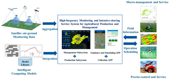 Remote sensing, the Internet, the Internet of Things (IoT), artificial intelligence, and other technologies have become the core elements of modern agriculture and smart farming. Agricultural production and management modes guided by data and services have become a cutting-edge carrier of agricultural information monitoring, which promotes the transformation of the intelligent computing of remote sensing big data and agricultural intensive management from theory to practical applications. In this paper, the main research objective is to construct a new high-frequency agricultural production monitoring and intensive sharing service and management mode, based on the three dimensions of space, time, and attributes, that includes crop recognition, growth monitoring, yield estimation, crop disease or pest monitoring, variable-rate prescription, agricultural machinery operation, and other automatic agricultural intelligent computing applications. The platforms supported by this mode include a data management and agricultural information production subsystem, an agricultural monitoring and macro-management subsystem (province and county scales), and two mobile terminal applications (APPs). Taking Shandong as the study area of the application case, the technical framework of the system and its mobile terminals were systematically elaborated at the province and county levels, which represented macro-management and precise control of agricultural production, respectively. The automatic intelligent computing mode of satellite–air–ground spatiotemporal collaboration that we proposed fully couples data obtained from satellites, unmanned aerial vehicles (UAVs), and IoT technologies, which can provide the accurate and timely monitoring of agricultural conditions and real-time guidance for agricultural machinery scheduling throughout the entire process of agricultural cultivation, planting, management, and harvest; the area accuracy of all obtained agricultural information products is above 90%. This paper demonstrates the necessity of customizable product and service research in agricultural intelligent computing, and the proposed practical mode can provide support for governments to participate in agricultural macro-management and decision making, which is of great significance for smart farming development and food security.