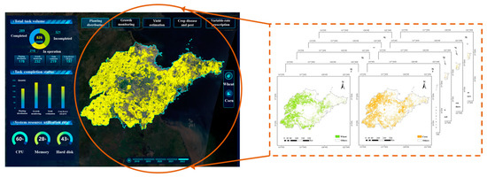 The rapid development of high-resolution remote sensing technology has laid the big data foundation for the acquisition, rapid update, and sharing of large-scale agricultural information [51]. The data management and agricultural information production subsystem consists of functional modules such as parallel operation of intelligent computing models and production scheduling at the task level, and corresponding computing service APIs to support the customized development of thematic information production and application systems. This subsystem aims to achieve workflow-oriented operations and production, including the allocation and management of production tasks, parallel computing of information products, and quality testing and examination of products. Following the collaborative computing route of satellite–air–ground monitoring, this subsystem organically combines remote sensing models, agricultural mechanisms, and intelligent computing from the three dimensions of time, space, and attributes. The focus is on optimizing the layout of the spatial and temporal monitoring network, as well as customizing the software production line for important agricultural information, such as planting spatiotemporal distribution, growth monitoring, disease or pest warning, irrigation, and pesticide and fertilizer prescriptions for wheat and corn. Through customized information production task scheduling and production processes, rapid, regular, and dynamic updates of agricultural information for wheat and corn can be realized in Shandong Province. It can automatically monitor wheat and corn growth every 7 days at the province level and every 5 days at the county level, extract spatial distribution of planting area, estimate yield once a year, monitor pests and diseases, and produce variable prescriptions of pesticides, irrigation, and fertilizers for wheat and corn as needed. In addition, based on the requirements of the application service, the subsystem provides customized agricultural remote sensing monitoring and analysis report to offer support for the government’s macro-management of agricultural conditions and related agricultural decision making. Figure 6 presents the intelligent calculation process of yield estimation as an example to introduce the production of agricultural information by this subsystem.