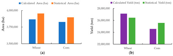Figure 12. Comparison of results regarding planting area and yield estimation in Shandong province: (a) comparison of calculated planting area with statistical data, and (b) comparison of calculated yield with statistical data.