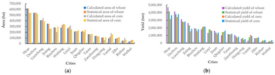 Figure 13. Comparison of calculated results with statistical data in 16 cities of Shandong province: (a) comparison of calculated planting area with statistical data, and (b) comparison of calculated yield with statistical data.