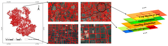 The precise control and service interface in the demonstration plot (Feicheng) was designed to meet the refined management application needs of county-level agricultural authorities and decision makers. Based on the integration of the proposed models and customized business process, it realizes automatic crop growth monitoring every 5 days at the county level; farmland parcel extraction (Figure 14), crop extraction, and yield estimation once a year; pest or disease monitoring; and variable prescriptions as needed. Figure 15 shows the precise control and service interface of the system in Feicheng (taking the satellite–air–ground monitoring interface as an example). In addition, it utilizes Beidou satellite navigation services to provide precise positioning and navigation services for ground IoT and intelligent agricultural machinery, which breaks through the current optimization configuration and operation scheduling of regional agricultural production materials and realizes the autonomous operation of agricultural machinery and intensive allocation of production materials. It was developed with a terminal information access interface to monitor crop growth, disasters, crop yield, and other factors of crops in real time during the growth process, which can evaluate and warn about agricultural disasters in advance to achieve real-time ground monitoring and dynamic updates of operational status. This system also provides users with functions such as information query, comprehensive analysis, statistics, and a visual display of the agricultural environment and production process for different counties, towns, crops, and time, which provide support for the government’s precise management and production scheduling of county-level agricultural industries.