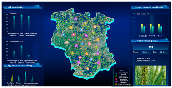 The data management and agricultural information production subsystem was developed aiming at fully tapping into various types of observation data, such as satellite, UAV, and IoT data, to achieve real-time access, management, and integration of remote sensing, field survey, meteorological, and soil data collected via a satellite–air–ground spatiotemporal collaboration network [45,46,47,48]. Figure 4 shows the satellite–air–ground monitoring network of this study.