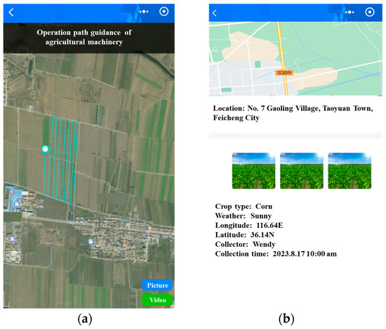Figure 16. Interface of APP: (a) agricultural information collection function of the Agricultural Information Collection APP, and (b) agricultural machinery operation function of the Agricultural Production Materials Guidance and Scheduling APP.