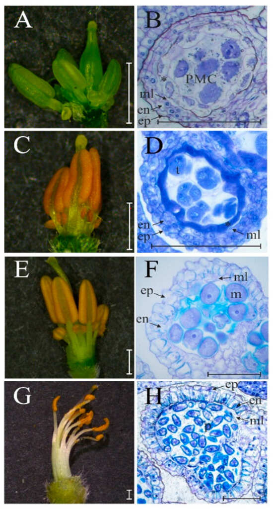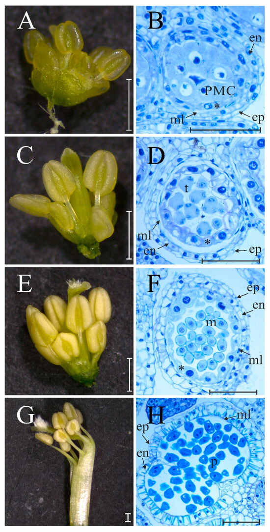 Morphology (the left panel) and cross-sections (the right panel) of Vicia faba anthers in different developmental stages: (A,B)—anthers containing pollen mother cells (PMCs); (C,D)—anthers containing tetrads; (E,F)—anthers with microspores at uninucleate stage; (G,H)—anthers with pollen grains. Figure legend: PMC—pollen mother cell, t—tetrads, m—microspores at uninucleate stage, p—pollen, ep—epidermis, en—endothecium, ml—middle layer; asterisks indicate tapetum. Bars in left panel = 1 mm, bars in right panel = 100 μm.