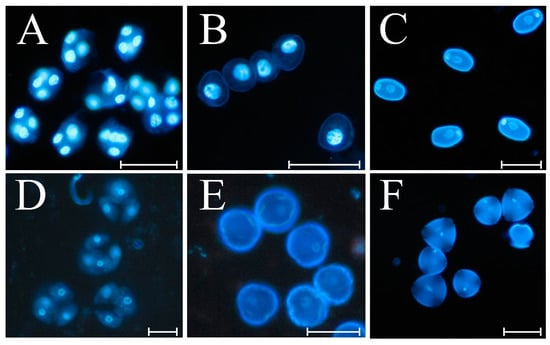 The different developmental stages of microspores and pollen of Vicia faba (upper panel) and Lupinus angustifolius (lower panel) after DAPI staining: (A,D)—tetrads; (B,E)—uninucleate microspores; (C,F)—binucleate pollen grains. Bar = 50 μm.