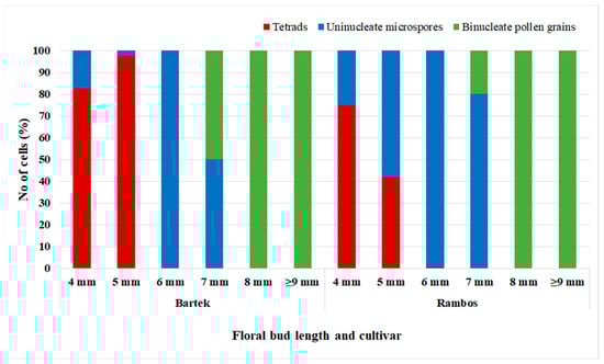 The results of the analysis of the stage of pollen development after DAPI staining in V. faba are presented in Figure 3A–C and Figure 4. In 4–5 mm ‘Bartek’ flower buds, tetrads (Figure 3A) were found in prevalence (82.5–97.4%). The ‘Rambos’ flower buds of 4 mm in size contained tetrads (74.77%), and uninucleate microspores (Figure 3B) were predominant (58.24%) in buds of 5 mm in size. The anthers of 6 mm floral buds contained mainly uninucleate microspores in both cultivars (‘Bartek’—100%, ‘Rambos’—99.67%); however, in ‘Rambos’ a small number of tetrads (0.33%) was found as well. In 7 mm floral buds, uninucleate microspores and binucleate cells (Figure 3C) in both cultivars were observed, though in ‘Bartek’ they were in equal proportions and in ‘Rambos’ uninucleate microspores were in the majority (80%). In the largest analyzed flower buds (8 and ≥9 mm) and opened flowers, only binucleate cells were found in both cultivars.