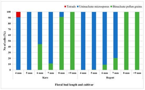 The results of the analysis of pollen development after DAPI staining in L. angustifolius are presented in Figure 3D–F and Figure 5. In 4 mm ‘Karo’ floral buds, the presence of tetrads (Figure 3D) was observed sporadically (9.20%). In 4–5 mm floral buds, mainly uninucleate microspores (90.80–100%) were observed in both cultivars. Floral buds of 6 mm contained uninucleate microspores (Figure 3E) and binucleate cells (Figure 3F) in different proportions depending on the cultivar: in ‘Karo’ the percentage of uninucleate microspores relative to binucleate cells was, respectively, 55.50% to 45.50%, while in ‘Regent’ it was 91.05% to 8.95%. Similar results were observed in 7 mm buds: in ‘Karo’ buds there was an 88.87% proportion of uninucleate microspores and 11.13% proportion of binucleate cells, whereas in ‘Regent’ there was a 79.51% proportion of uninucleate microspores and 20.49% proportion of binucleate cells. In ‘Karo’ floral buds that were 8 mm in length, binucleate cells were predominant (91.31%), but uninucleate microspores (8.69%) were also observed. In similar ‘Regent’ buds, only binucleate cells were found. In the largest analyzed (9 mm) flower buds of both L. angustifolius cultivars, binucleate pollens were observed exclusively.
