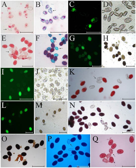 Vicia faba microspores (A–D,I,J) and pollen grains (E–H,K–Q) subjected to different staining methods: (A,E)—acetocarmine; (B,F)—Alexander’s dye; (C,D,G,H)—Calcein method: (C,G)—the view in fluorescence, (D,H)—the same field of view in bright field microscopy; (I,J,L,M)—FDA method: (I,L)—the view in fluorescence, (J,M)—the same field of view in bright field microscopy; (K)—TTC method; (N)—MTT method; (O)—Lugol’s iodine staining; (P)—aniline blue in lactophenol method; (Q)—aceto-orcein staining. Arrows indicate nonviable microspores or pollen grains. Bar = 100 μm.