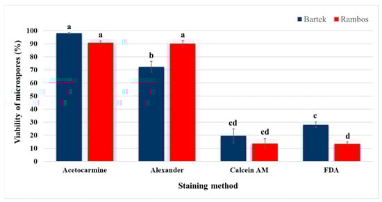 The viability of V. faba microspores depending on the cultivar is presented in Figure 7. The results showed no difference in the viability of microspores between the tested V. faba cultivars after acetocarmine (90.90–98.20%) and Calcein AM (13.70–19.50%) staining. Using Alexander’s method for staining, more viable microspores (90.20%) were detected in ‘Rambos’ compared with ‘Bartek’ (72.40%). However, after applying FDA, higher viability (28.0%) was detected among microspores of ‘Bartek’, compared with ‘Rambos’ (13.50%).