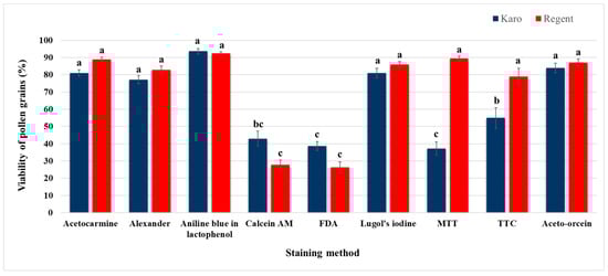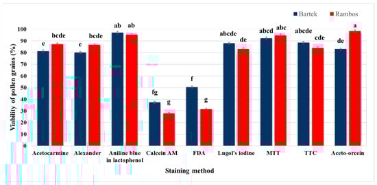 Viability of Vicia faba pollen grains determined using nine different staining methods depending on cultivar. Bars represent means ± SEM. Means denoted with the same letters are not significantly different (HSD, p ≤ 0.05).