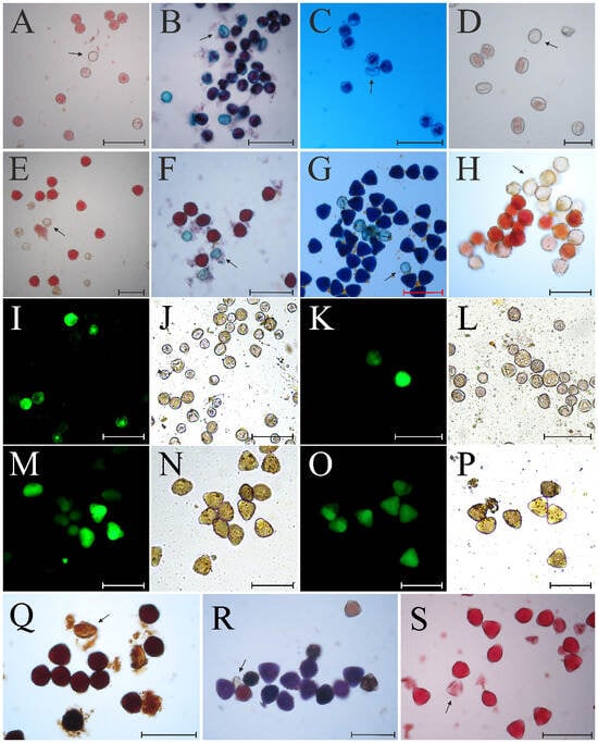 Lupinus angustifolius microspores (A–D,I–L) and pollen grains (E–H,M–S) subjected to different staining methods: (A,E)—acetocarmine staining; (B,F)—Alexander’s staining; (C,G)—aniline blue in lactophenol method; (D,H)—TTC method; (I,J,M,N)—Calcein method: (I,M)—the view in fluorescence, (J,N)—the same field of view in bright field microscopy; (K,L,O,P)—FDA method: (K,O)—the view in fluorescence, (L,P)—the same field of view in bright field microscopy; (Q)—Lugol’s iodine staining; (R)—MTT method; (S)—aceto-orcein staining. Arrows indicate nonviable microspores or pollen grains. Bar = 100 μm.