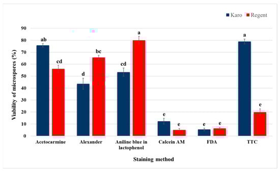 The interaction between cultivar and staining method on microspore viability was observed in L. angustifolius (Figure 10). A higher microspore viability for ‘Regent’ in comparison with ‘Karo’ was detected after application of Alexander’s dye (65.54% and 43.65%, respectively) and aniline blue in lactophenol (79.90% and 53.40%, respectively). Contrast observations were made after application of acetocarmine (75.70% for ‘Karo’ and 56.10% for ‘Regent’) and TCC (79% for ‘Karo’ and 19.80% for ‘Regent’). Similar to V. faba, the lowest percentages of viable microspores were detected using Calcein AM and FDA in both cultivars and they ranged from 5% to 12.3%, which was significantly different than the percentages of viable microspores determined with other methods.