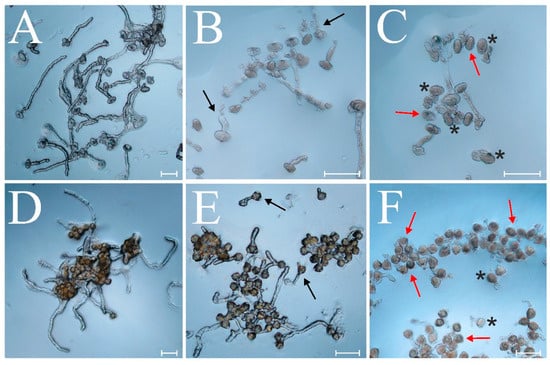 Phase contrast microphotography of Vicia faba (A–C) and Lupinus angustifolius (D–F) after in vitro pollen germination: (A,D)—germinated pollen grains with typical pollen tubes; (B,E)—pollen grains with deformed pollen tubes (indicated by black arrows); (C,F)—non-germinated pollen grains (indicated by red arrows). Asterisks indicate bursting of pollen grains. Bar = 100 μm.