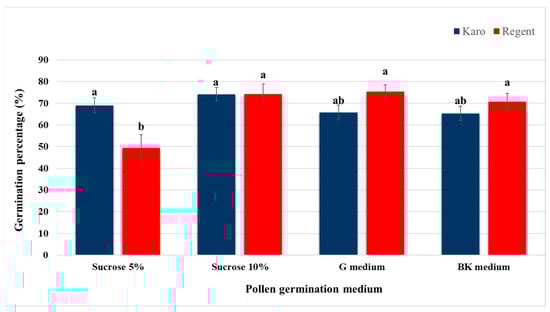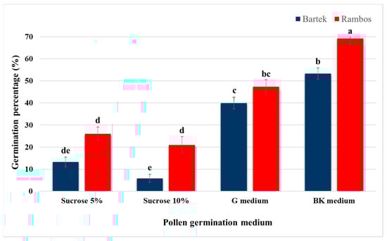 In this experiment, a minimum of 300 pollen grains on each medium per single cultivar was counted (with one slide per flower and 3 flowers for each cultivar).