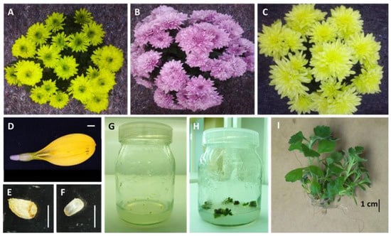 Three chrysanthemum cultivars used in the study: ‘Brasil’ (A), ‘Capitola’ (B) and ‘Jewel Time Yellow’ (C); ligulate flower of ‘Jewel Time Yellow’ cultivar (D); cut off ovary (E); isolated ovule (F); ovaries inoculated on the induction medium (G); regenerating explants in the growth room (H); regenerated plantlet (I); bar = 1 mm (D–F) or 1 cm (I).